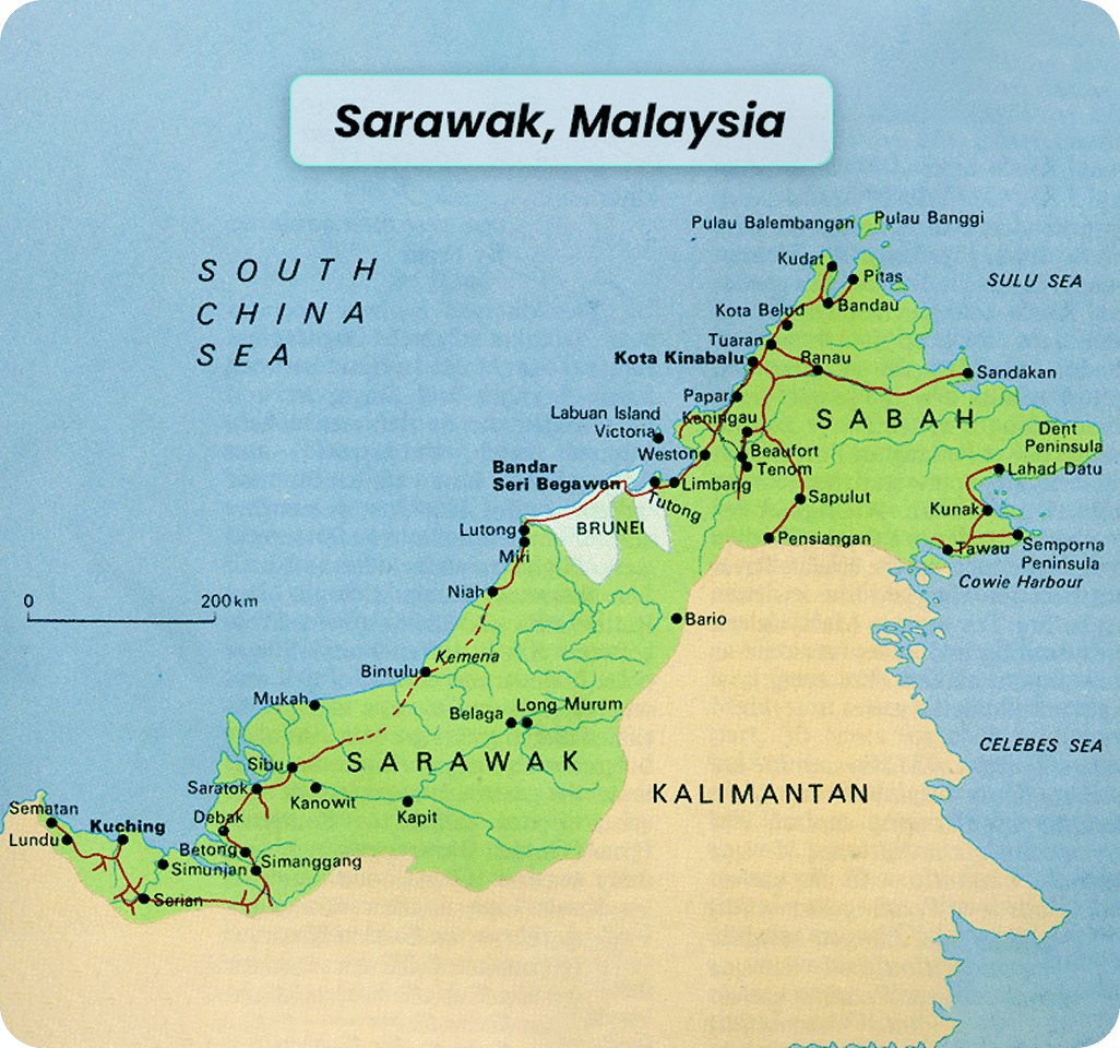 Sarawak is the largest state in Malaysia, located on the northwestern coast of the island of Borneo. Covering an area of about 124,450 km², it is slightly larger than the entire peninsula of Malaysia. Known as the “Land of the Hornbills” due to the prominence of hornbills in its culture and natural environment, Sarawak is celebrated for its lush rainforests, diverse wildlife, rich cultural heritage, and harmonious blend of traditions and modern development.